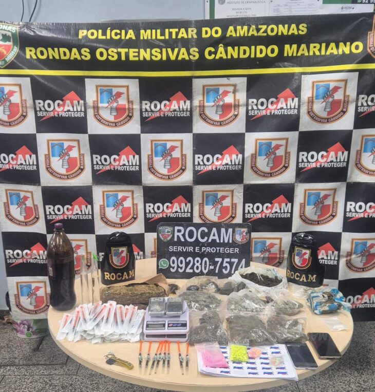 A Polícia Militar do Amazonas (PMAM), por meio das Rondas Ostensivas Cândido Mariano (Rocam), prendeu dois homens, de 24 e 28 anos, suspeitos de envolvimento com o tráfico de drogas. A ação ocorreu na noite de segunda-feira (24/11), no bairro Tarumã, zona oeste de Manaus, e resultou na apreensão de uma grande quantidade de entorpecentes.