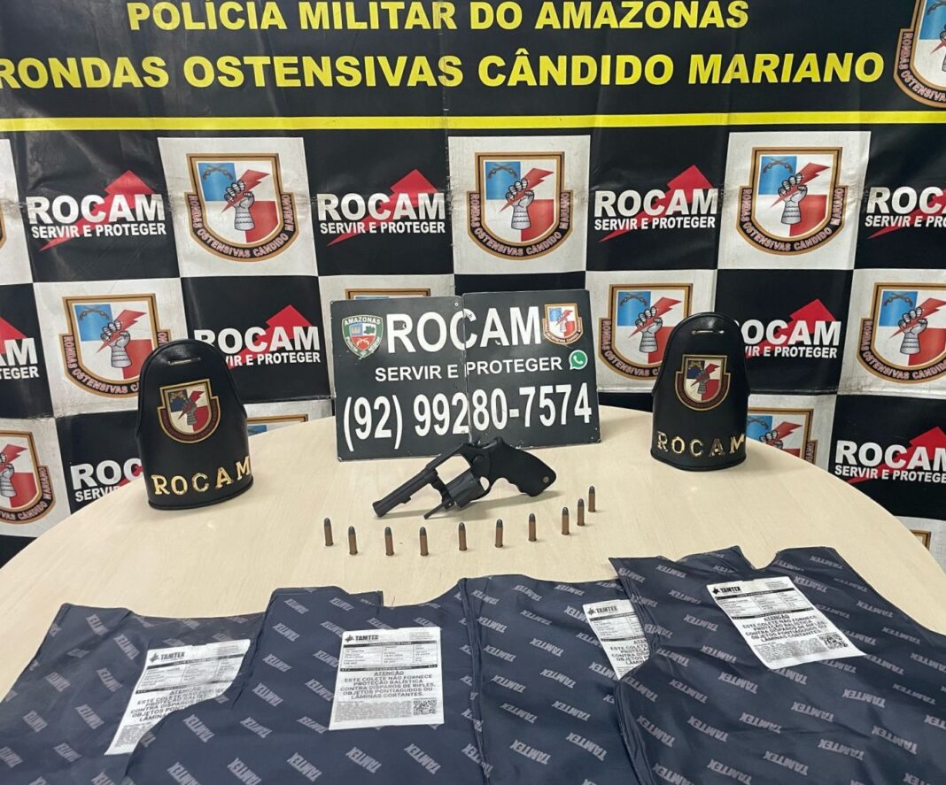 A Polícia Militar do Amazonas, por meio das Rondas Ostensivas Cândido Mariano (Rocam), prendeu dois homens, de 23 e 29 anos, e apreendeu uma arma de fogo, munições e coletes balísticos, na manhã de quarta-feira (05/03), após denúncia sobre furto ocorrido em uma empresa de segurança, localizada na rua Vasco Vasques, bairro Parque 10 de Novembro, zona centro-sul de Manaus.
