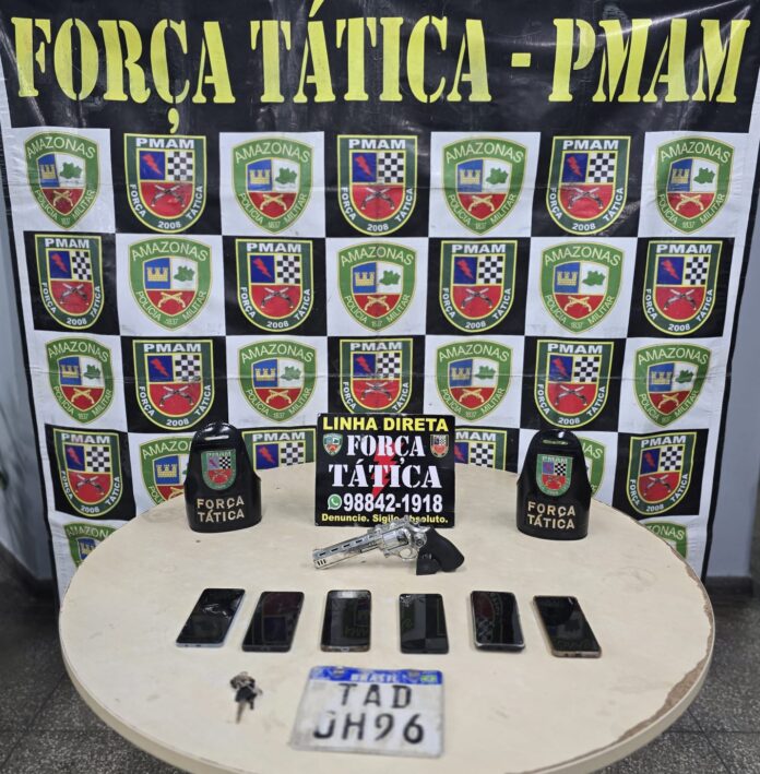 Diante da denúncia, a equipe da PMAM foi até o local juntamente com a vítima, que reconheceu dois suspeitos nas proximidades. Foi realizada a abordagem e revista pessoal, sendo encontrado com um deles um simulacro de arma de fogo na cintura, além de cinco aparelhos celulares nos bolsos, incluindo o telefone pertencente à vítima.