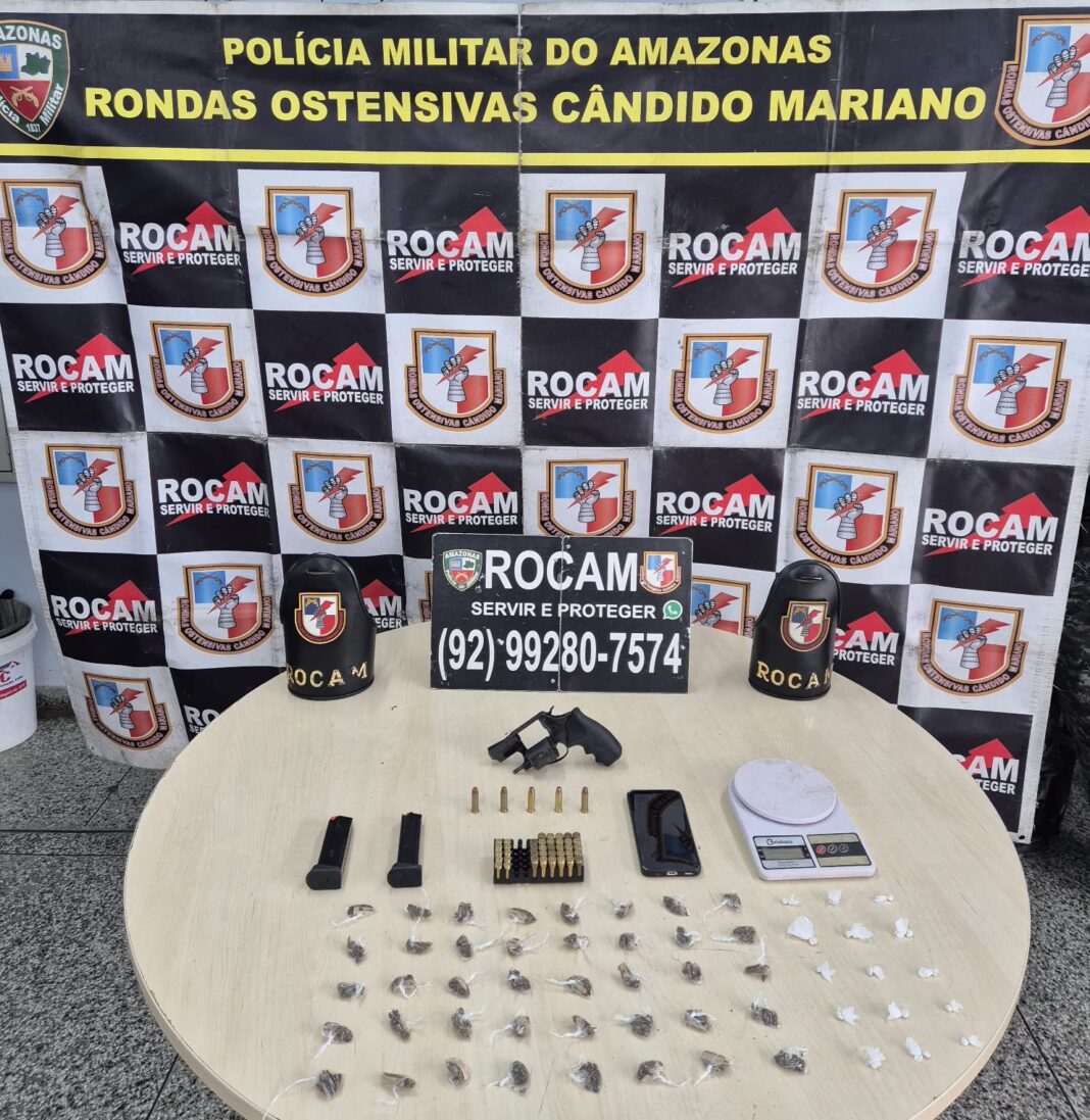 A Polícia Militar do Amazonas (PMAM), por meio das Rondas Ostensivas Cândido Mariano (ROCAM), prendeu um homem, de 20 anos, envolvido com o tráfico de drogas, na tarde desta segunda-feira (24/02), no bairro Tarumã Açu, zona oeste de Manaus. Com ele, foram apreendidos um revólver, munições, carregadores de pistola, porções de drogas, balança de precisão e um aparelho celular.