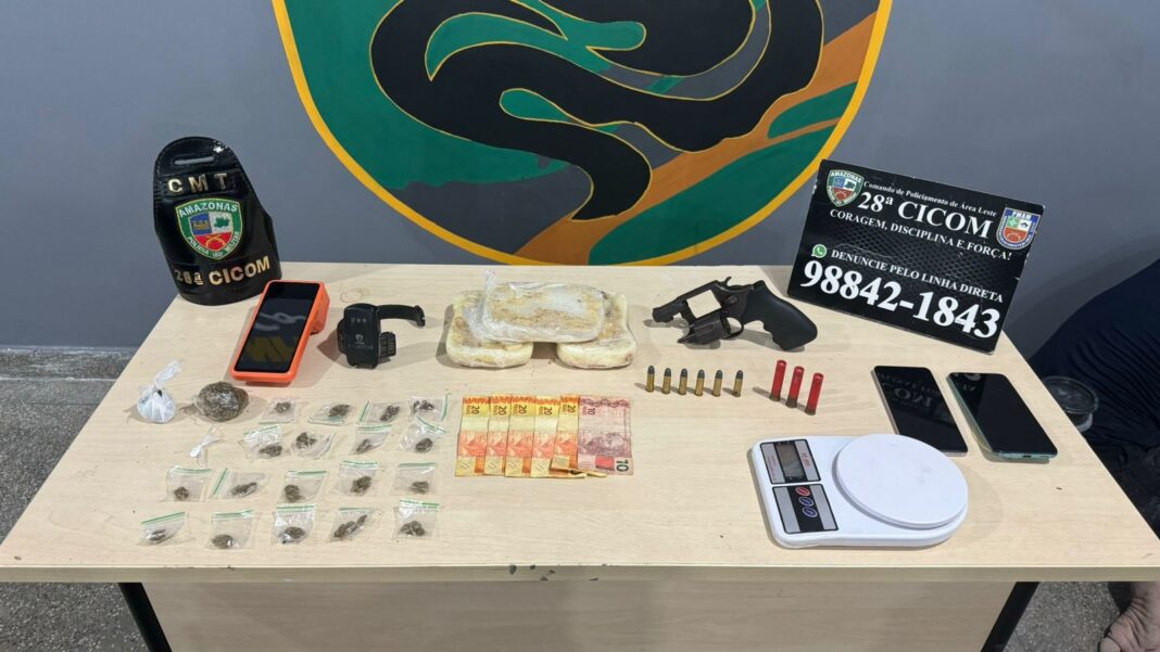A Polícia Militar do Amazonas (PMAM), por meio da 28ª Companhia Interativa Comunitária (Cicom), prendeu um homem, de 33 anos, e apreendeu uma arma de fogo e mais de três quilos de entorpecentes, na terça-feira (18/09). A ação policial aconteceu no bairro Distrito Industrial, zona leste da capital.