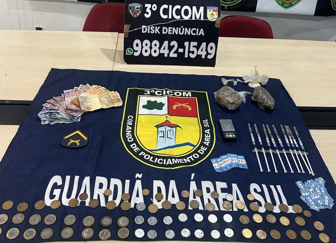 A Polícia Militar do Amazonas (PMAM), por meio da 3ª Companhia Interativa Comunitária (Cicom), prendeu um homem, de 24 anos, que estava em posse de substâncias ilícitas, incluindo porções de maconha, maconha tipo skunk e cocaína, além de seringas contendo extrato de maconha. A ação policial aconteceu na manhã de segunda-feira (24/03), no bairro Japiim, zona sul de Manaus.