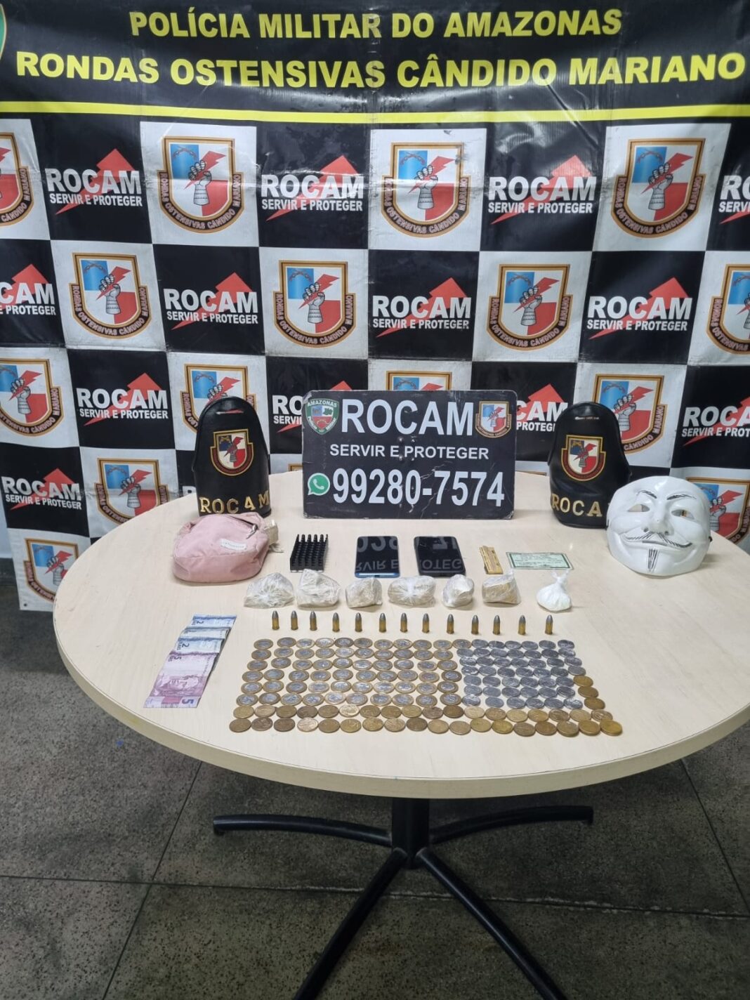 Na tarde de domingo, policiais militares das Rondas Ostensivas Cândido Mariano (Rocam) realizavam incursão na rua 11, conjunto Canaranas, bairro Cidade Nova, quando suspeitos fugiram ao perceber a presença da equipe. Durante varredura no local, os PMs encontraram um revólver calibre 38 com duas munições. O material foi apreendido e encaminhado ao 6º Distrito Integrado de Polícia (DIP).