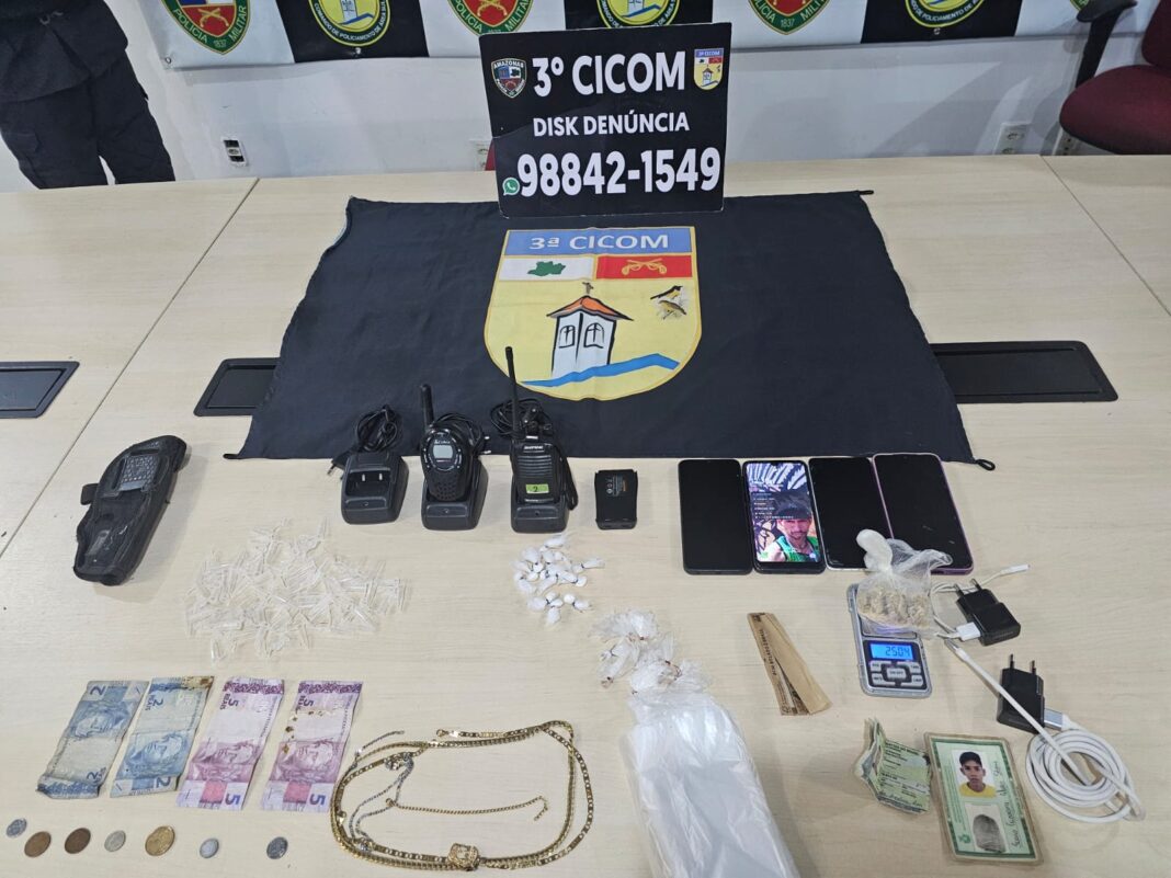 Com eles, foram apreendidos 66 pinos de cocaína, 15 trouxinhas de cocaína, dez trouxinhas de oxi, uma porção de oxi, além de uma balança de precisão e dois rádios comunicadores. Os suspeitos e o material ilícito foram encaminhados ao 1º Distrito Integrado de Polícia (DIP).
