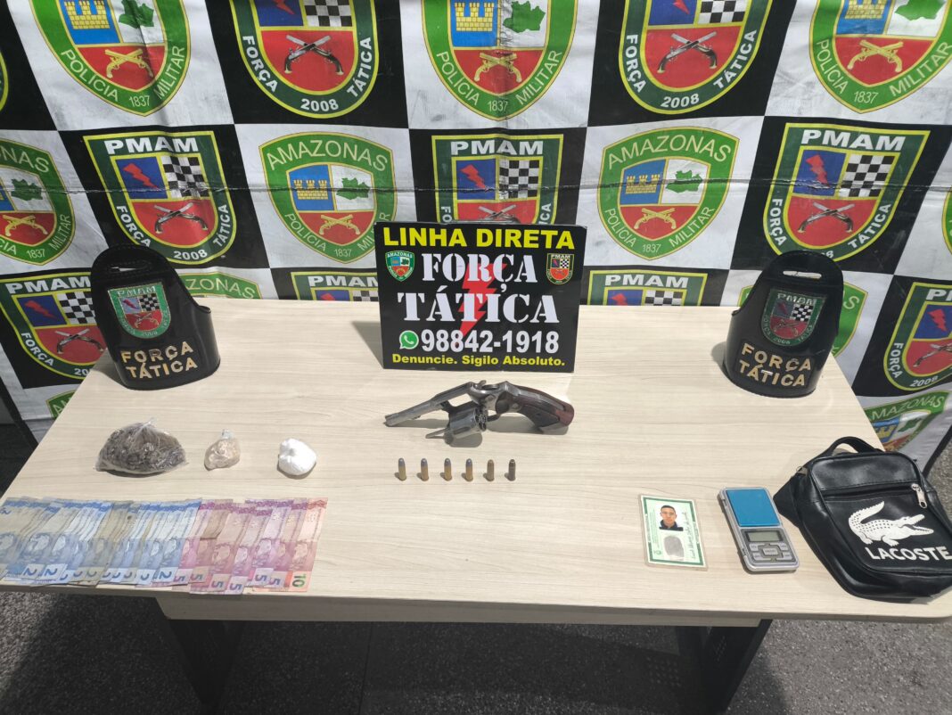 Durante a fuga, ele entrou em um igarapé, mas foi contido. Com ele, foi encontrado um revólver calibre .38 com duas munições percutidas e quatro intactas, além de uma balança de precisão, 43g de maconha/Skank, 39g de cocaína e 21g de oxi. O suspeito, que já possui antecedentes criminais por roubo, foi levado ao 6° DIP.