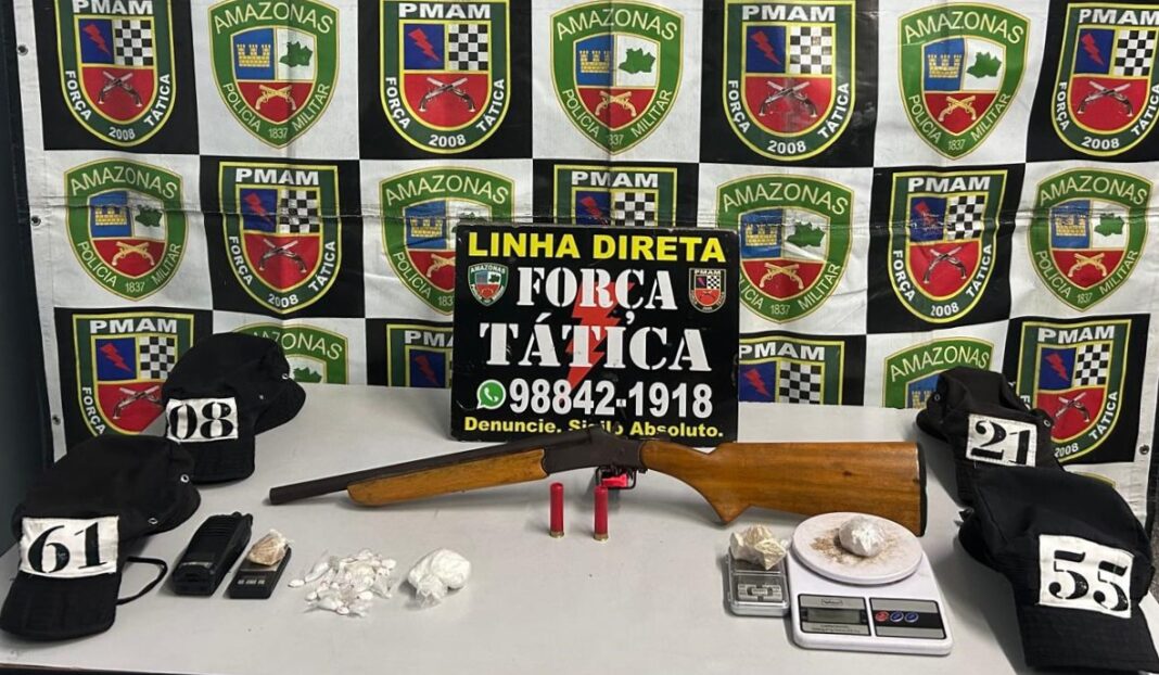 Durante patrulhamento, a equipe da PMAM avistou um grupo que fugiu ao perceber a aproximação das viaturas, deixando para trás uma pochete, com pequenas porções de entorpecentes, e uma mochila contendo uma espingarda calibre 28 sem munições, duas munições calibre 28 não deflagradas, além de 17 trouxinhas de cocaína, uma porção de cocaína, três de oxi, uma de maconha, três balanças de precisão e um rádio comunicador.