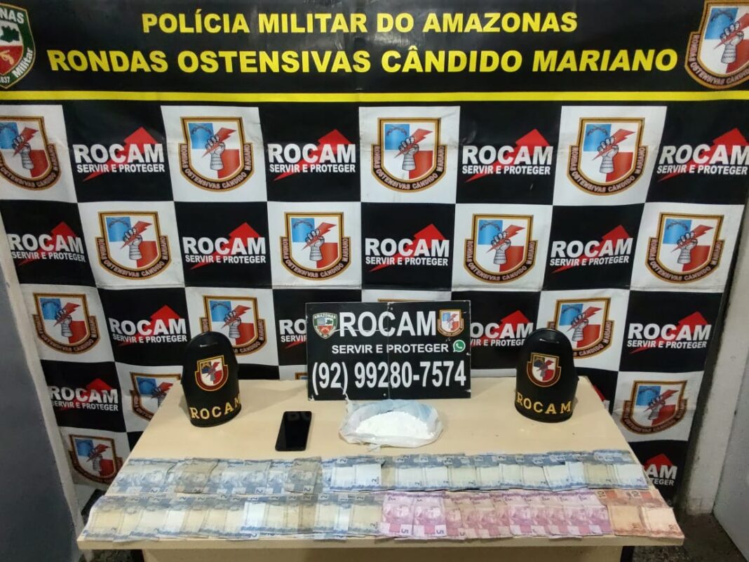 A Polícia Militar do Amazonas (PMAM), por meio das Rondas Ostensivas Cândido Mariano (Rocam), recapturou um foragido da Justiça, de 25 anos, e apreendeu uma porção de droga e mais de R$ 300 em espécie, na noite de sexta-feira (26/04), no bairro Chapada, zona centro-sul de Manaus.