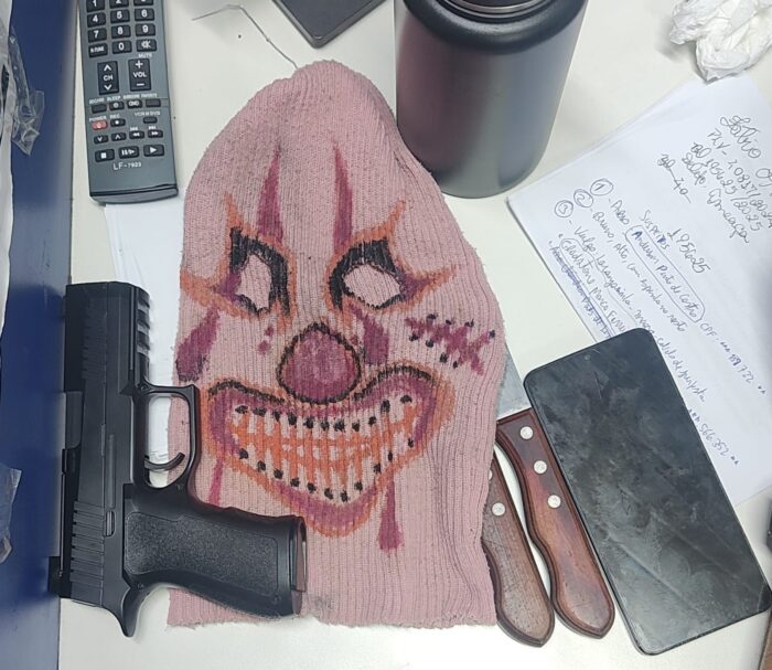 A ocorrência foi encaminhada para o 1º Distrito Integrado de Polícia (DIP). Além da prisão, foram apreendidos um simulacro de arma de fogo, duas facas e uma máscara com pintura de palhaço.