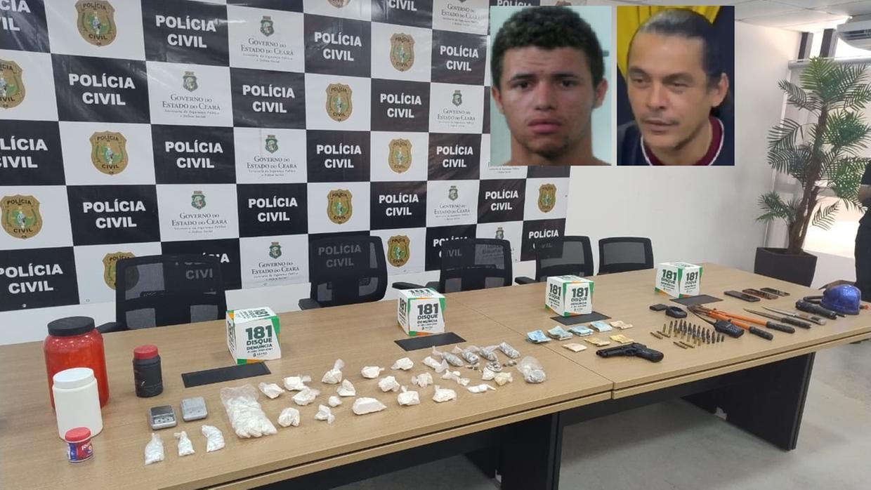 Legenda: Drogas e armas foram apreendidas em operação da Polícia Civil do Ceará que tinha 'Skidum' e 'Doca' (na ordem das fotografias) como alvos Foto: Montagem/ Reprodução