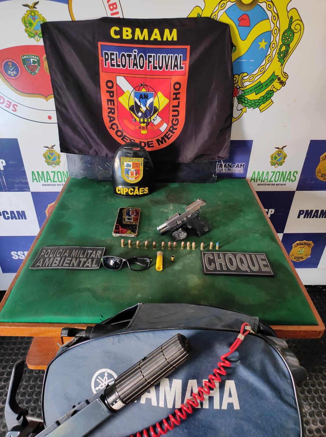 Foram realizadas buscas pela região, onde foram apreendidos uma pistola taurus, 28 munições calibre 38, uma embarcação do modelo bote, e um motor de popa, além do celular e estojo de munição deflagrados. Todo material apreendido foi encaminhado ao Distrito Integrado de Polícia (DIP) da Base Arpão 1.