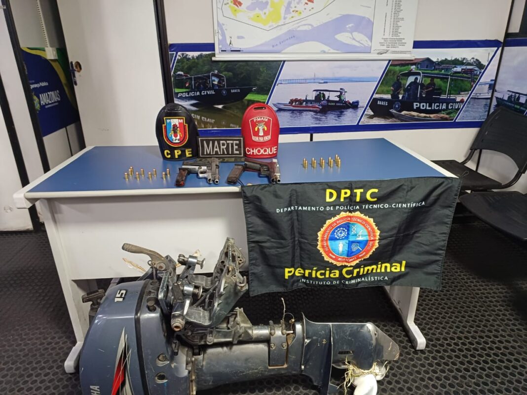 Na embarcação dos infratores, os policiais apreenderam duas pistolas calibre 9 milímetros e 20 munições. “Essa ação exitosa mostra que o nosso trabalho nos rios em conjunto com a Base Arpão está tendo resultado é que estamos vigilantes”, afirmou o comandante Moreira.