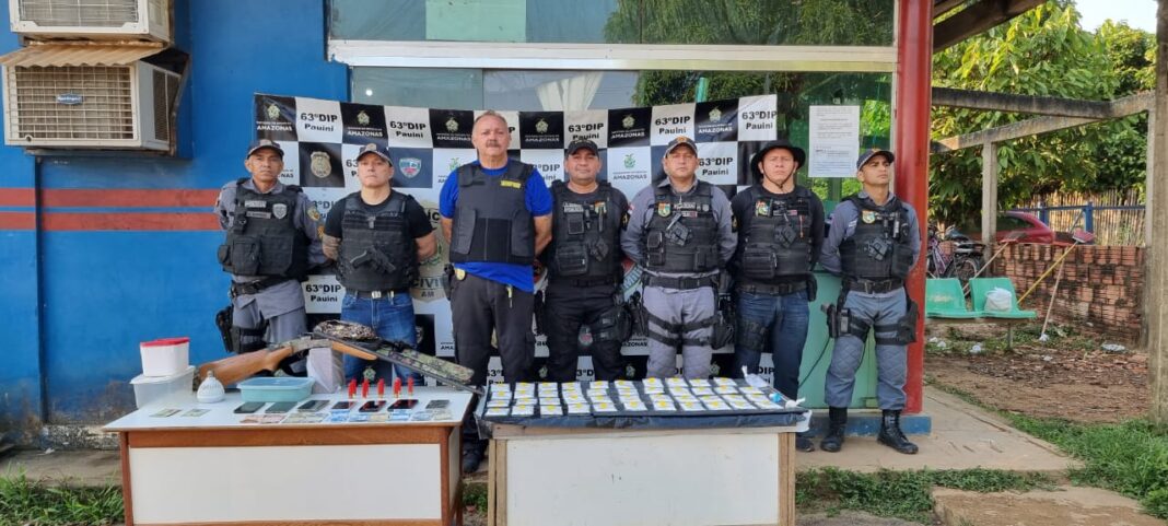 Policiais civis da 63ª Delegacia Interativa de Polícia (DIP) de Pauini (a 923 quilômetros de Manaus), com apoio de policiais militares, cumpriram, nesta terça-feira (15/08), por volta das 6h, mandados de busca e apreensão que resultou na apreensão de 44 pacotes de pasta base de cocaína e uma porção da mesma substância, uma espingarda calibre 28, oito munições intactas e uma deflagrada, além de sete aparelhos celulares.