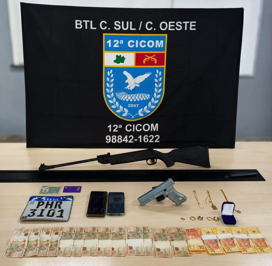 Com os suspeitos, foram apreendidos R$ 750 em espécie, um comprovante via pix, no valor de R$3.000,00, dois aparelhos celulares, bolsas, anéis, cordões e uma medalha. Também foram recolhidas uma arma de ar comprimido do tipo carabina, um simulacro de arma de fogo tipo pistola e uma motocicleta Honda CG, de cor vermelha, utilizada na ação criminosa.