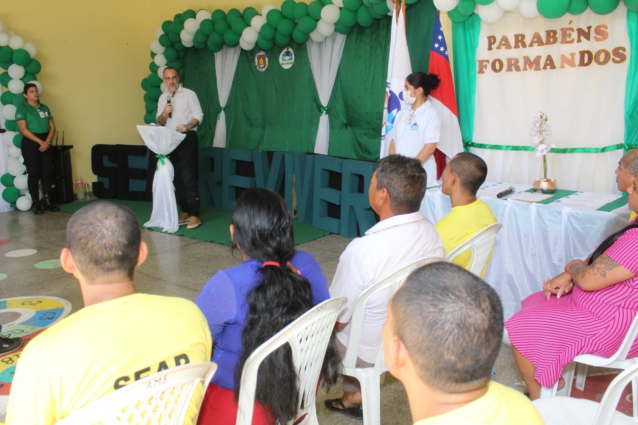 Estiveram presentes na cerimônia, gestores e servidores da Seap, a juíza de direito da Comarca de Itacoatiara, Drª Juline Rossendy Rosa Neres, representada por Fernanda Prado e Maza Takeno; o sub comandante do 2º Batalhão da Polícia Militar do município, Major Martins; o Representante do Cetam-Itacoatiara, Edilson Ramos dos Santos; o pároco da Prelazia da cidade, padre Acácio; além dos colaboradores das empresas terceirizadas e familiares dos formandos.