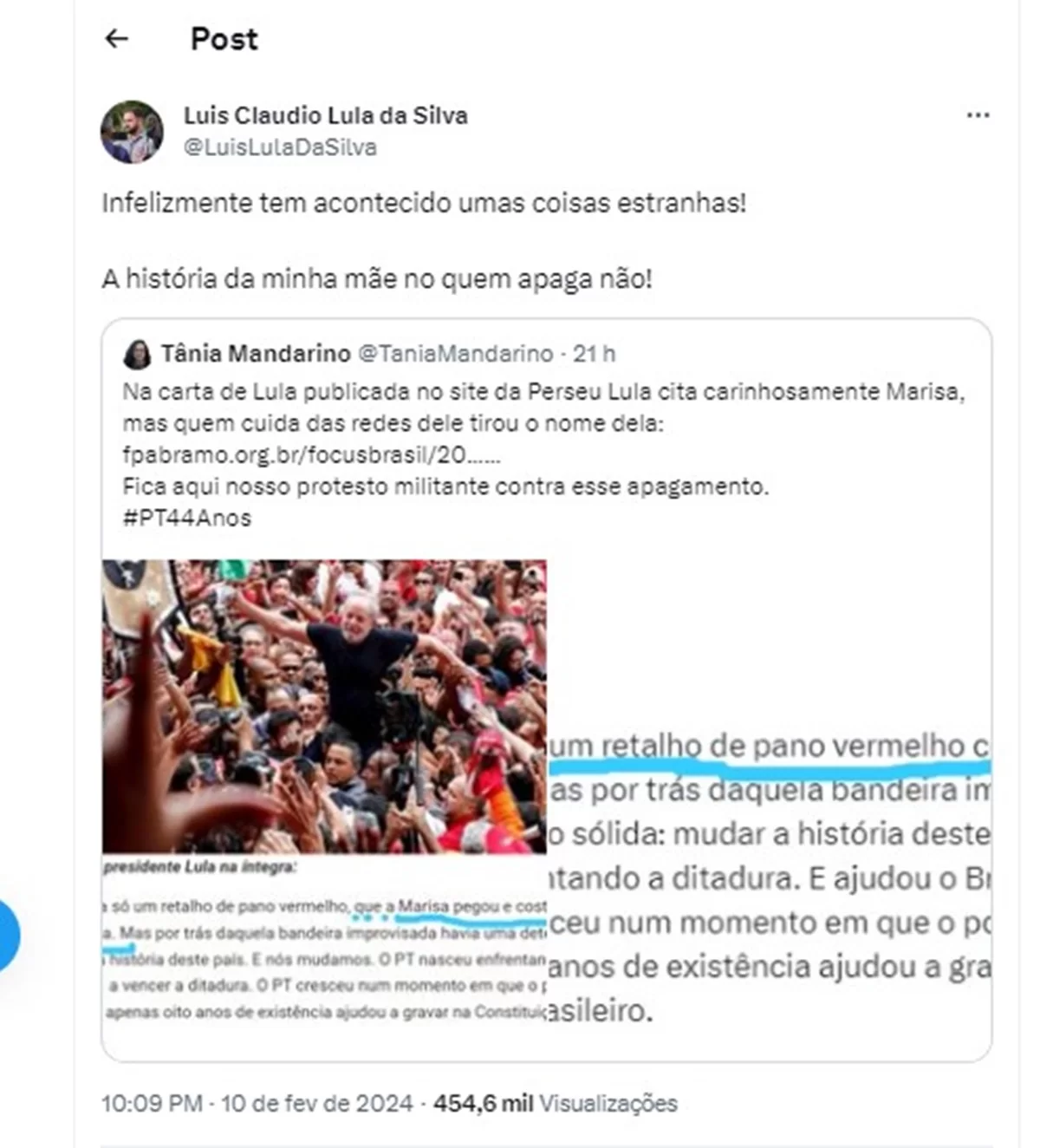 Uma postagem do presidente Luiz Inácio Lula da Silva nas redes sociais sobre o aniversário de 44 anos do PT gerou uma polêmica que incluiu até um dos seus filhos: Luis Cláudio Lula da Silva. Ele também usou as redes, mas para reclamar da retirada do nome da mãe, a ex-primeira-dama Marisa Letícia, falecida em 2017, do texto publicado. Janja tem sido privilegiada no twitter pela Secom do Palácio.