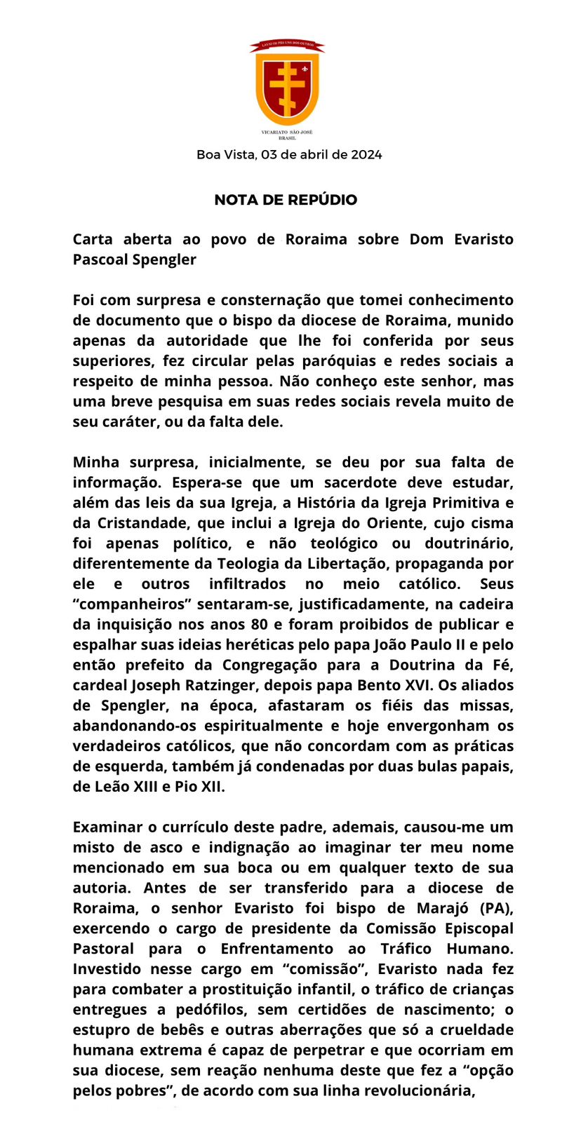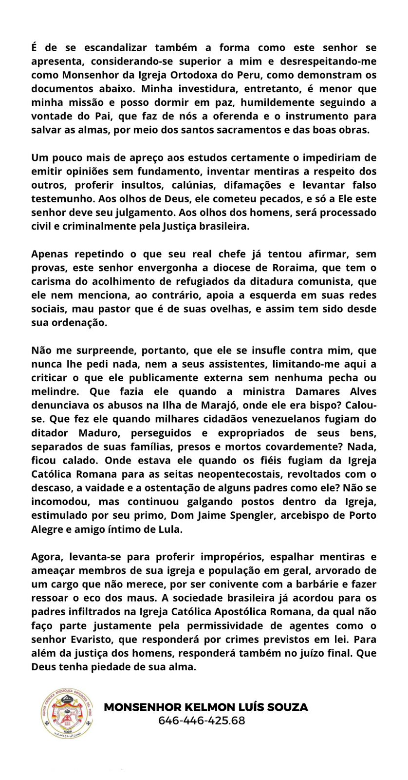 A Diocese esquerdista de Roraima publicou uma nota fake news sobre um dos ícones da Direita, o padre ortodoxo, Kelmon Luis da Silva Souza, conhecido como “Padre Kelmon”, na última terça-feira (6). O documento apócrifo foi assinado pelo Bispo da Diocese, eleitor da lulista da esquerda, Dom Evaristo Pascoal Splenger.