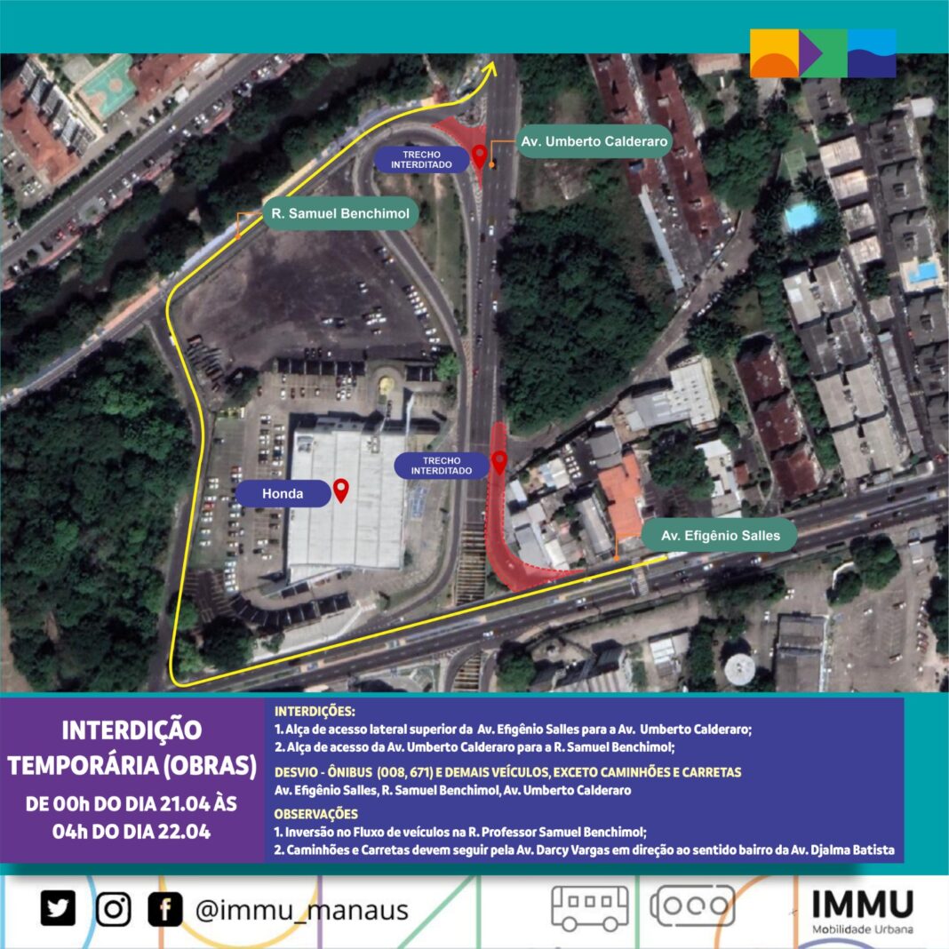 A Prefeitura de Manaus, por meio do Instituto Municipal de Mobilidade Urbana (IMMU), informa que na madrugada da próxima segunda-feira, 22/4, entre 0h e 4h, o acesso para o bairro Parque 10 de Novembro dos condutores que vêm da avenida Ephigênio Salles para avenida Umberto Calderaro, pela alça lateral da passagem subterrânea, estará interditado para realização de obras da Companhia de Gás do Amazonas (Cigás) no local.