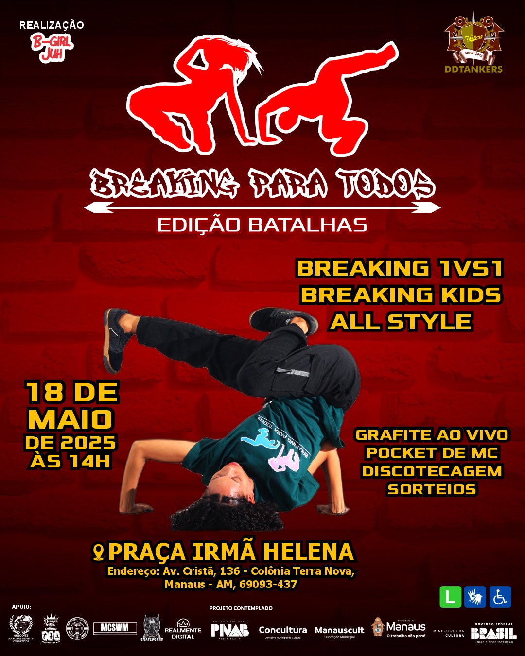 Mais uma edição do projeto “Breaking Para Todos – Edição Batalhas” está programada para este domingo, 18/5, a partir das 14h, praça Irmã Helena, na avenida Cristã, bairro Colônia Terra Nova, zona Norte. Contemplado pelo edital nº 004/2024, da Política Nacional Aldir Blanc (Pnab), da Prefeitura de Manaus, por meio do Conselho Municipal de Cultura (Concultura), o evento tem como objetivo fortalecer e valorizar a cultura hip-hop na capital amazonense.