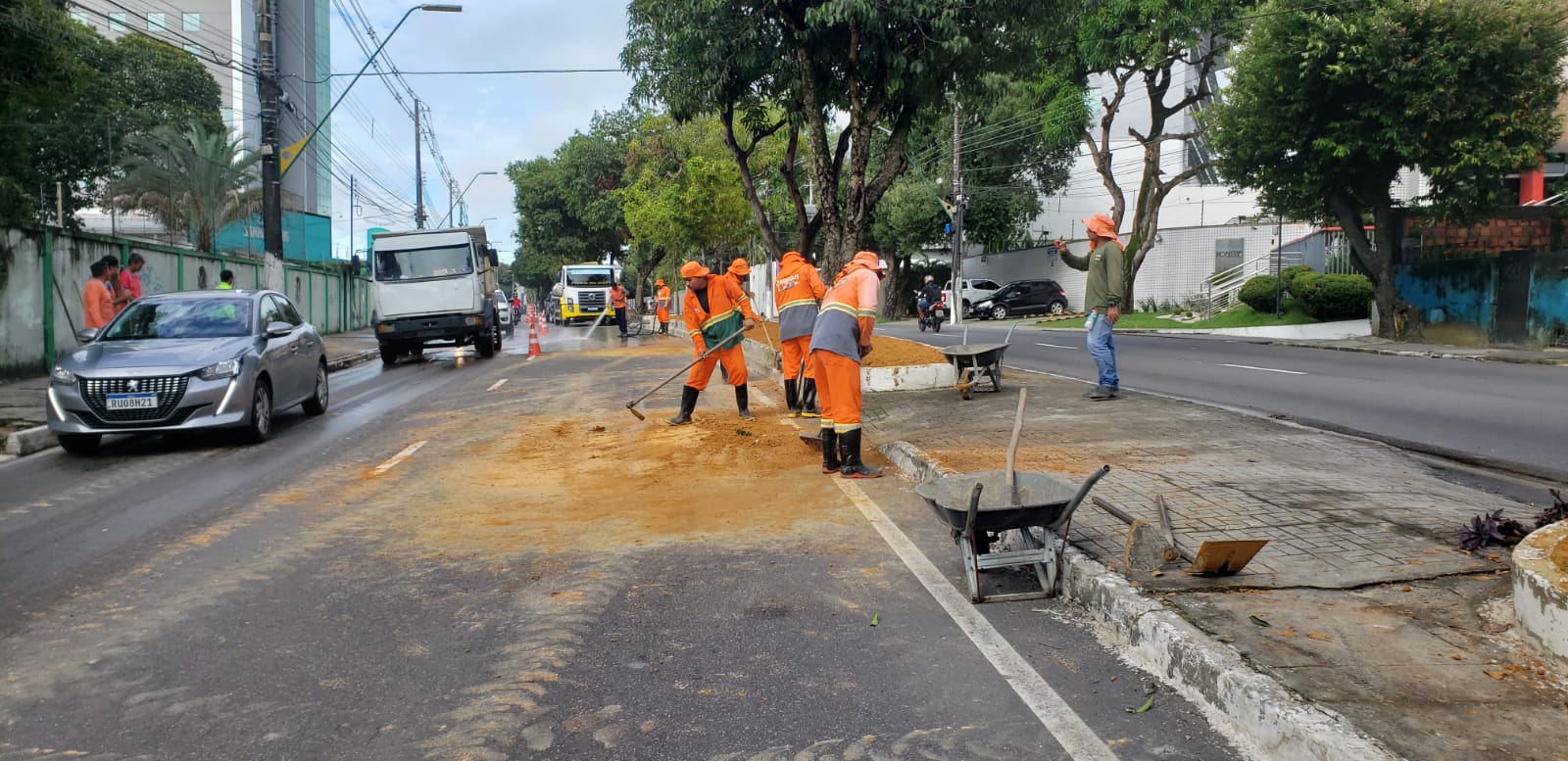 Ao todo foram mobilizados para o serviço 100 homens que estrategicamente agiram em vários pontos de uma só vez, e assim deram agilidade a operação. Um carro-pipa foi usado para lavar as duas avenidas, nos pontos onde ficou resto do barro que foi usado nos canteiros.