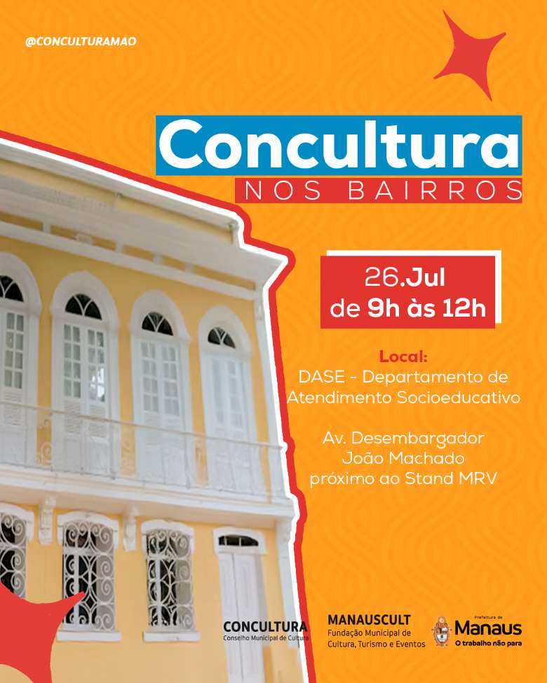 Em uma iniciativa da Prefeitura de Manaus, por meio do Conselho Municipal de Cultura (Concultura), será realizada, no dia 26 de julho, a primeira edição do projeto “Concultura nos Bairros”, com o objetivo de levar conhecimento acerca das políticas públicas de cultura promovidas pela pasta. O evento ocorrerá no Departamento de Atendimento Socioeducativo (Dase), localizado na zona Centro-Sul da cidade, a partir das 9h.