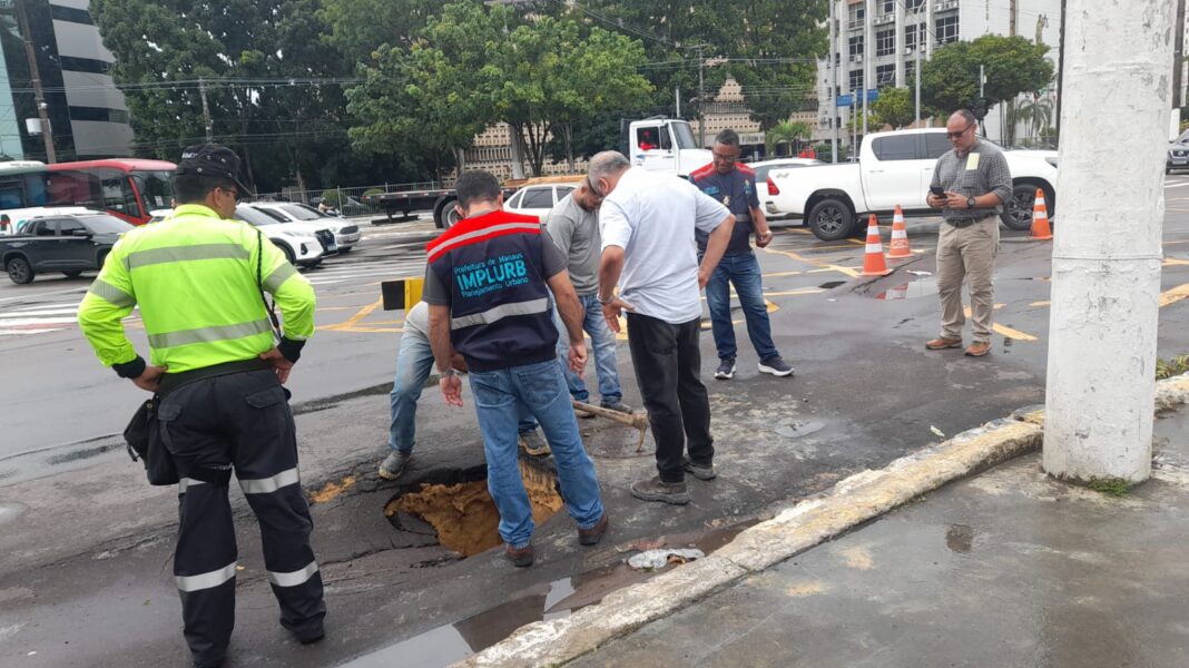 Prefeitura de Manaus atua em afundamento na rua Salvador e notifica empresa e concessionária para reparo na via
