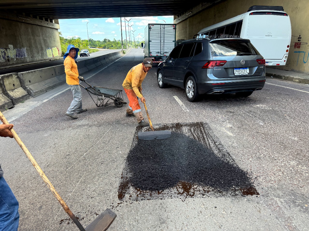 Paralelo a esse trabalho, outra equipe executa a obra de recuperação asfáltica na avenida Santos Dumont, localizado no bairro Colônia Santo Antônio, com destino ao aeroporto. As equipes identificaram um buraco na entrada de um viaduto das proximidades e realizam a manutenção.