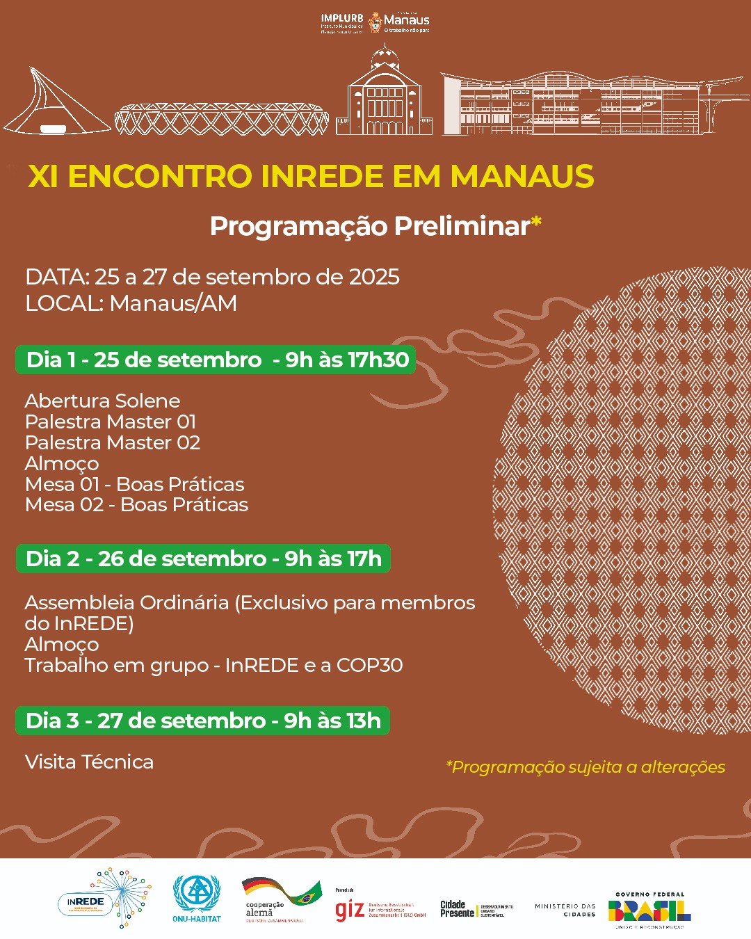 De 25 a 27 de setembro, a Prefeitura de Manaus será anfitriã do 11º Encontro Nacional da Rede Brasileira de Institutos de Planejamento (InRede), por meio do Instituto Municipal de Planejamento Urbano (Implurb). Com o tema “Desenvolvimento Urbano Integrado”, o evento reunirá especialistas e gestores para debater soluções ambientais, enfrentar os desafios das mudanças climáticas e construir caminhos sustentáveis para as cidades brasileiras.