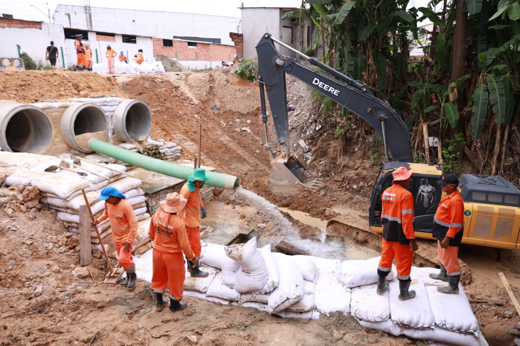 Na recuperação da rede drenagem profunda, a equipe avançou com a execução da implantação de três linhas de tubulação em concreto armado e também de PVC, para captar a água da chuva das caixas coletoras. Nesta fase da obra, a equipe formada por 30 trabalhadores, atua na contenção de rip-rap, em que as sacas são preenchidas com cimento e areia tornando esse material mais resistente, na qual protegerá as margens do igarapé evitando novos deslizamentos.