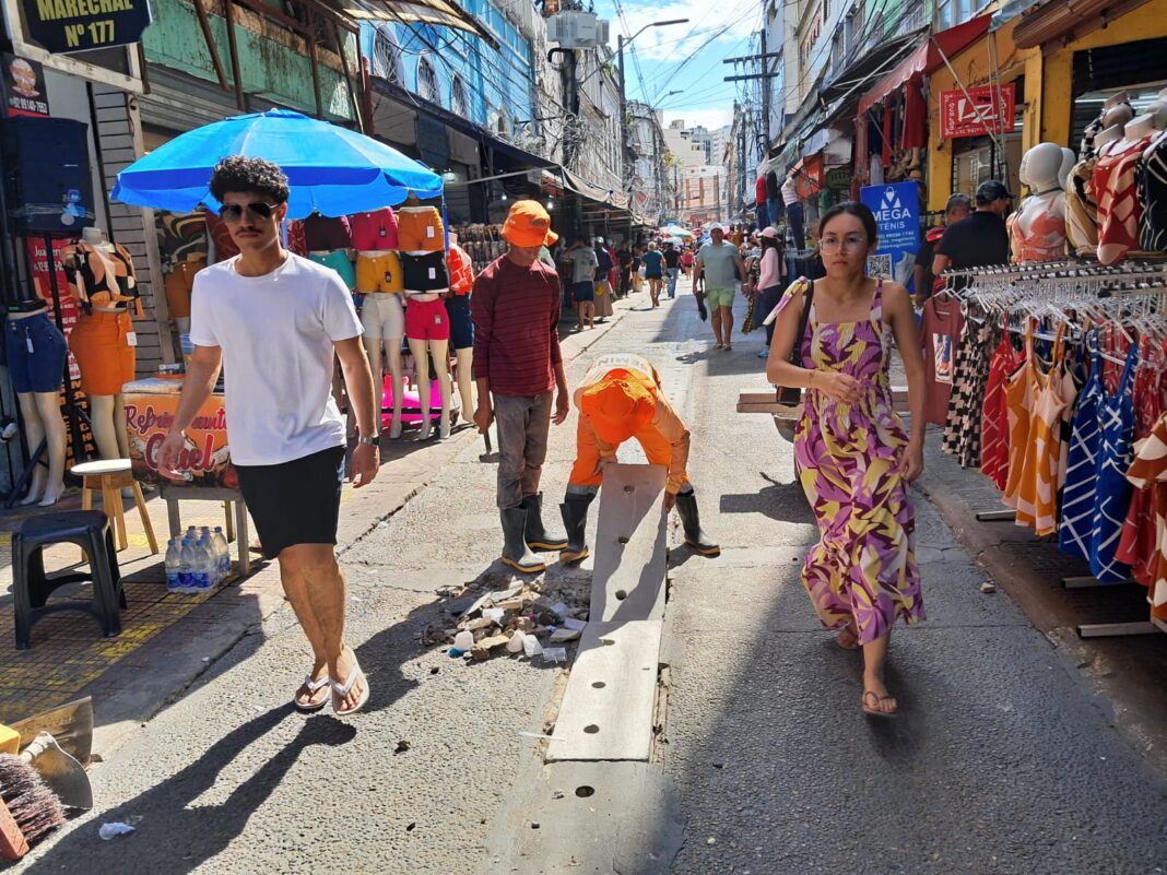 Na rua Marechal Deodoro, uma das mais movimentadas do Centro, com grande presença de comércio popular, a prefeitura dá continuidade à manutenção das canaletas e instala novas tampas de concreto armado, promovendo mais segurança e acessibilidade para quem circula na área diariamente.