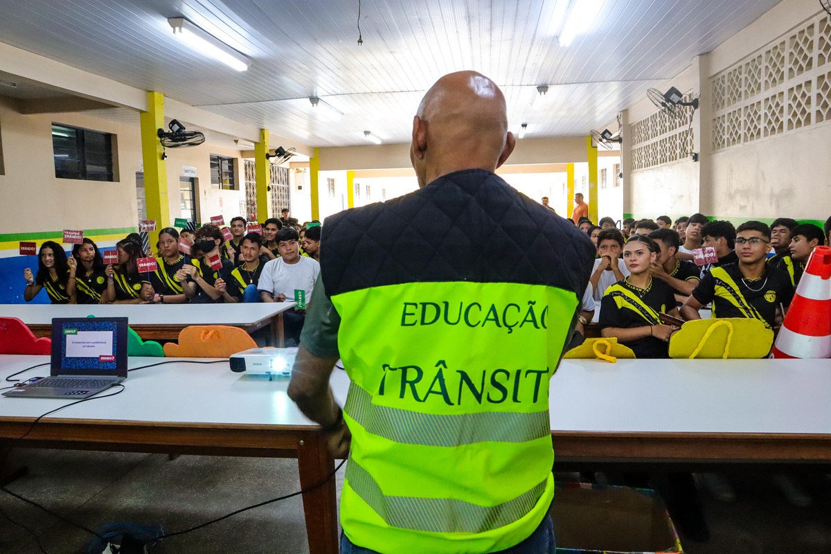 Um momento de descontração e adquirir conhecimento sobre trânsito. Este foi o espírito de uma ação educacional promovida, nesta quarta-feira, 11/6, pela Prefeitura de Manaus, por meio do Instituto Municipal de Mobilidade Urbana (IMMU), na escola estadual Inspetora Dulcinéia Varela Moura, no bairro Novo Israel, zona Norte da capital.