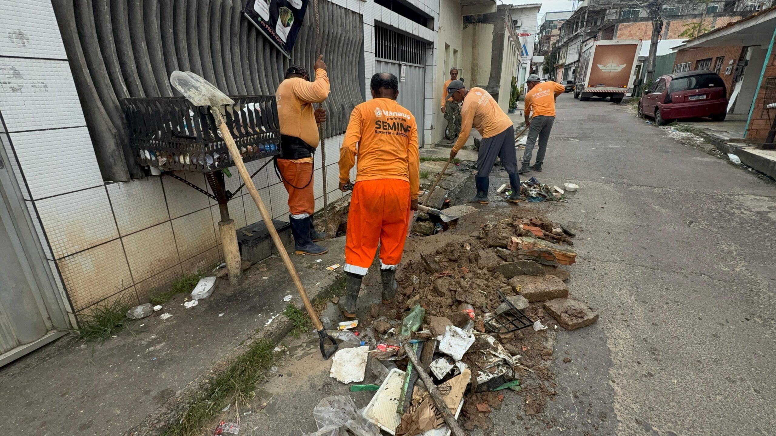 A Prefeitura de Manaus, por meio da Secretaria Municipal de Infraestrutura (Seminf), realiza a recuperação da rede de drenagem da rua Nova, no bairro Alvorada 1, zona Oeste, nesta quinta-feira, 25/4, para prevenir de alagamentos e garantir o escoamento correto das águas das chuvas.