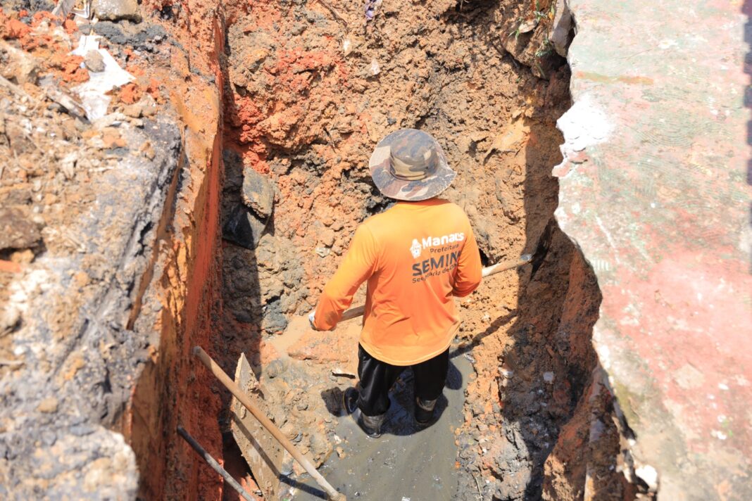A Prefeitura de Manaus, por meio da Secretaria Municipal de Infraestrutura (Seminf), executa, nesta quinta-feira, 9/10, a recuperação de um trecho da rede de drenagem profunda na rua Belém, no bairro Compensa, zona Oeste. A manutenção emergencial foi iniciada após o surgimento de uma cratera de aproximadamente dois metros de profundidade, causada pela deterioração da tubulação obstruída por lixo.
