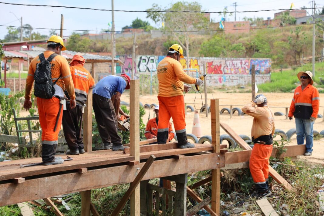Duas pontes de madeira estão sendo reconstruídas pela Prefeitura de Manaus, por meio da Secretaria Municipal de Infraestrutura (Seminf), nesta sexta-feira, 27/9, na comunidade Nova Vida, antiga “Cemitério Indígena”, localizada no bairro Nova Cidade, zona Norte da cidade.