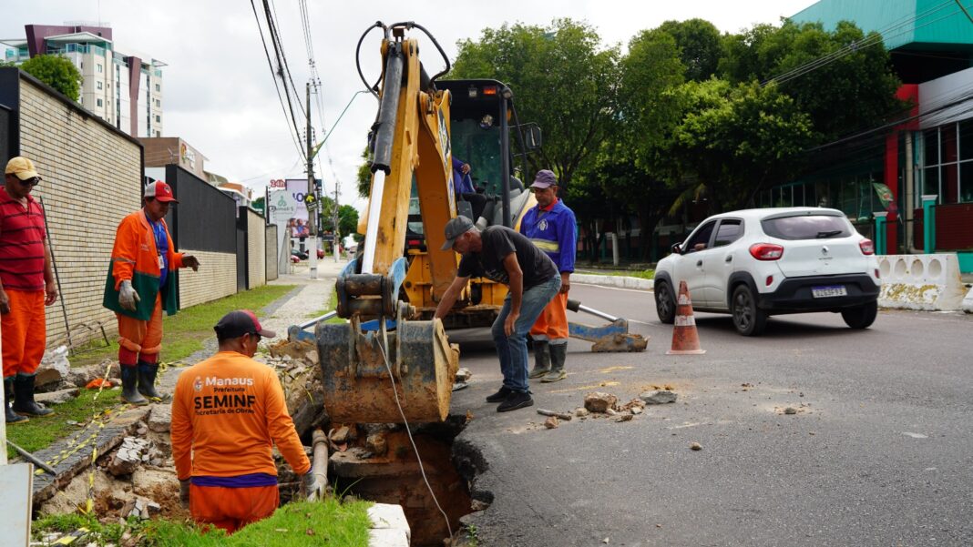 A Prefeitura de Manaus, por meio da Secretaria Municipal de Infraestrutura (Seminf), deu início, nesta quarta-feira, 9/4, à recuperação da rede de drenagem profunda na avenida Jornalista Umberto Calderaro Filho, no bairro Adrianópolis, zona Centro-Sul, após uma cratera comprometer um trecho da lateral da via e da calçada.