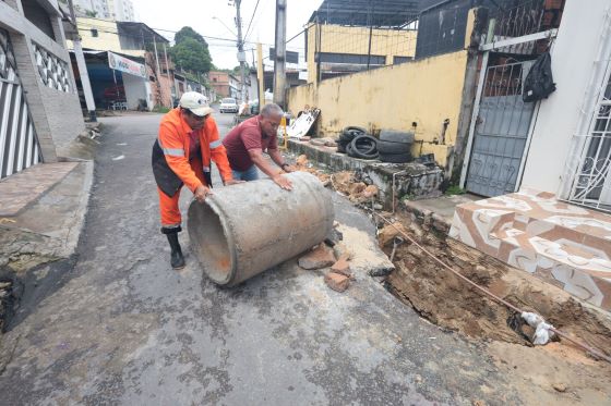 A Prefeitura de Manaus, por meio da Secretaria Municipal de Infraestrutura (Seminf), iniciou, nesta segunda-feira, 17/3, a recuperação da rede de drenagem profunda do beco Palmas, no bairro São José Operário, zona Leste da capital. A intervenção atende a um pedido dos moradores e inclui a substituição de três tubos danificados por novas manilhas em concreto armado, além da desobstrução e limpeza da caixa coletora.