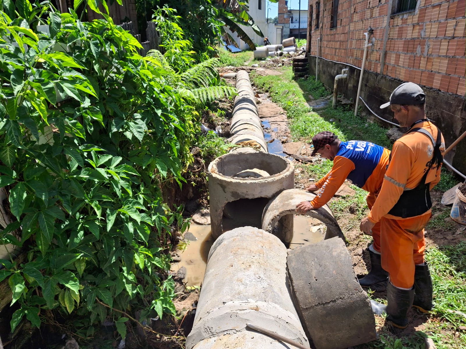As equipes atuam na instalação de novas manilhas de concreto armado, estruturas robustas que vão compor um sistema de drenagem com 70 metros de extensão, garantindo maior eficiência no fluxo das águas pluviais. O reforço na rede subterrânea é essencial para reduzir pontos de acúmulo e melhorar a infraestrutura de toda a área.