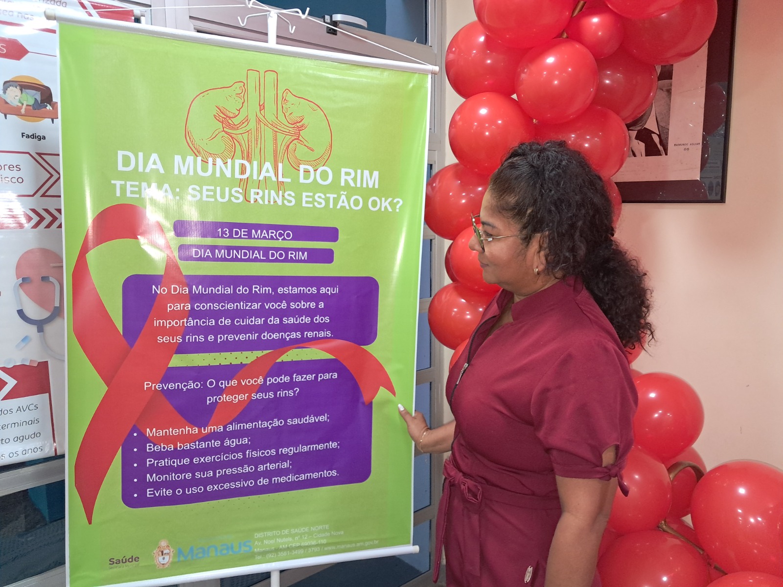 A importância do cuidado com a saúde dos rins foi o tema da ação educativa promovida pela Prefeitura de Manaus, nesta quinta-feira, 13/3, na Unidade de Saúde da Família (USF) Prefeito Manoel Ribeiro, no conjunto residencial Viver Melhor 3, bairro Cidade de Deus, na zona Norte. O evento, realizado em alusão ao Dia Mundial do Rim, comemorado todos os anos na segunda quinta-feira do mês de março, contou com a promoção de palestras e atividade lúdica, abordando as principais formas de manter a saúde renal e prevenir a Doença Renal Crônica (DRC).