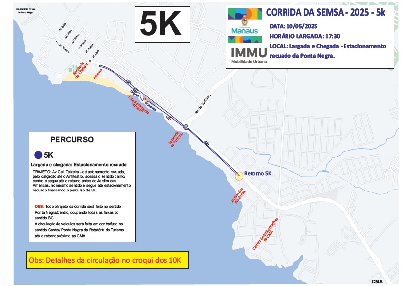 A Prefeitura de Manaus, por meio do Instituto Municipal de Mobilidade Urbana (IMMU), montou uma estrutura especial de trânsito para dar suporte à corrida “Manaus em Movimento 2025”, que acontece neste sábado, 10/5, com largada às 16h, no estacionamento recuado do complexo turístico Ponta Negra, zona Oeste. As interdições iniciam às 14h. Agentes de trânsito atuarão na orientação aos motoristas para garantir a segurança dos pedestres durante as travessias e circulações.