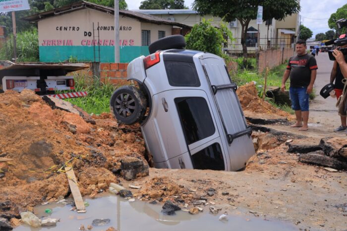 Um veículo desrespeitou o isolamento e a sinalização de uma obra da Prefeitura de Manaus e invadiu, na madrugada desta quinta-feira, 16/4, a área em manutenção na rua Lagoa da Pedra, no conjunto Canaranas, bairro Cidade Nova, zona Norte. O automóvel atingiu o trecho onde é realizada a recuperação da rede de drenagem profunda.