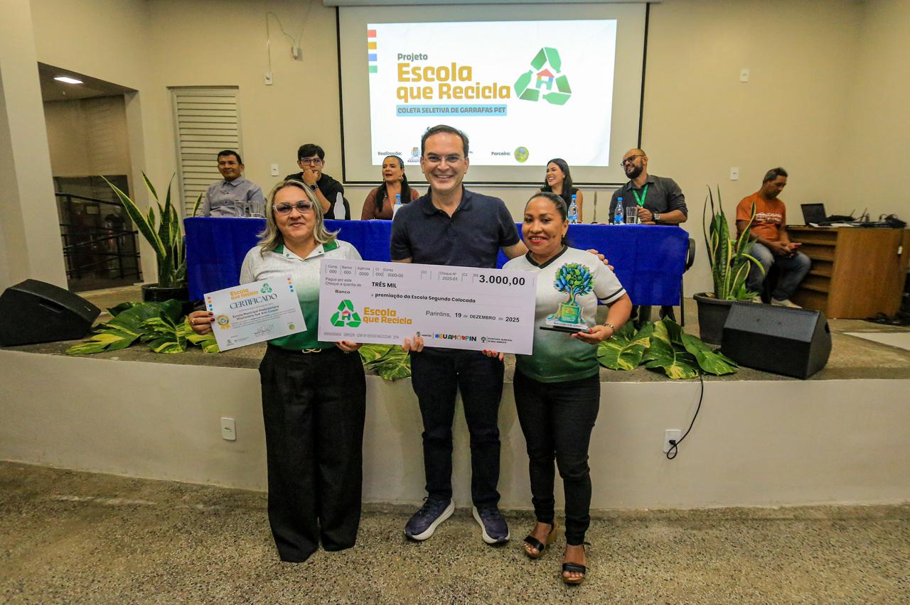 A Prefeitura Municipal de Parintins premiou, nesta sexta-feira (19), as três escolas campeãs do projeto “Escola que Recicla”, iniciativa voltada à educação ambiental e ao incentivo à coleta seletiva no ambiente escolar. Ao todo, o projeto arrecadou 12.014,40 toneladas de garrafas PET, com a participação de 23 escolas da rede municipal.