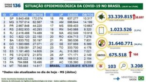 Desde o início da pandemia, o país acumula 33,3 milhões de casos confirmados da doença e 675,5 mil mortes registradas. Os casos de recuperados somam 31,6 milhões (94,9 % dos casos).