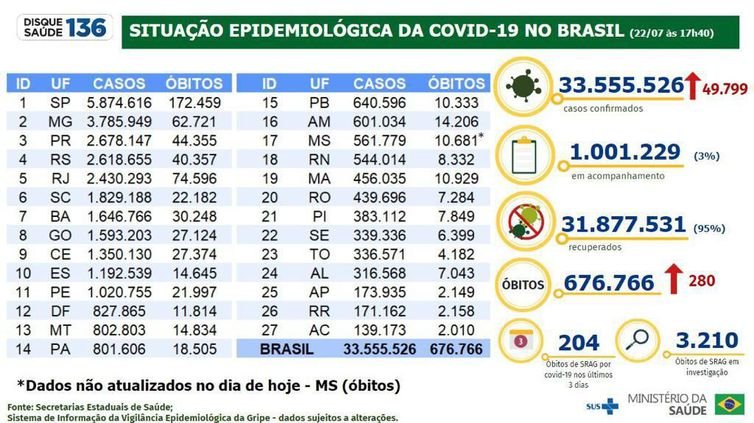 Desde o início da pandemia, o país acumula 33,5 milhões de casos confirmados e 676,7 mil mortes registradas. Os casos de recuperados somam 31,8 milhões (95% dos casos).