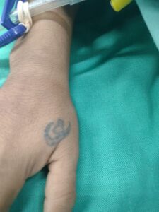 De acordo com o serviço social, o paciente foi levado ao hospital por terceiros, que saíram do local após deixá-lo na porta da unidade. O homem tem tatuagens na mão direita, sendo uma meia lua e letras em cada dedo da mão.