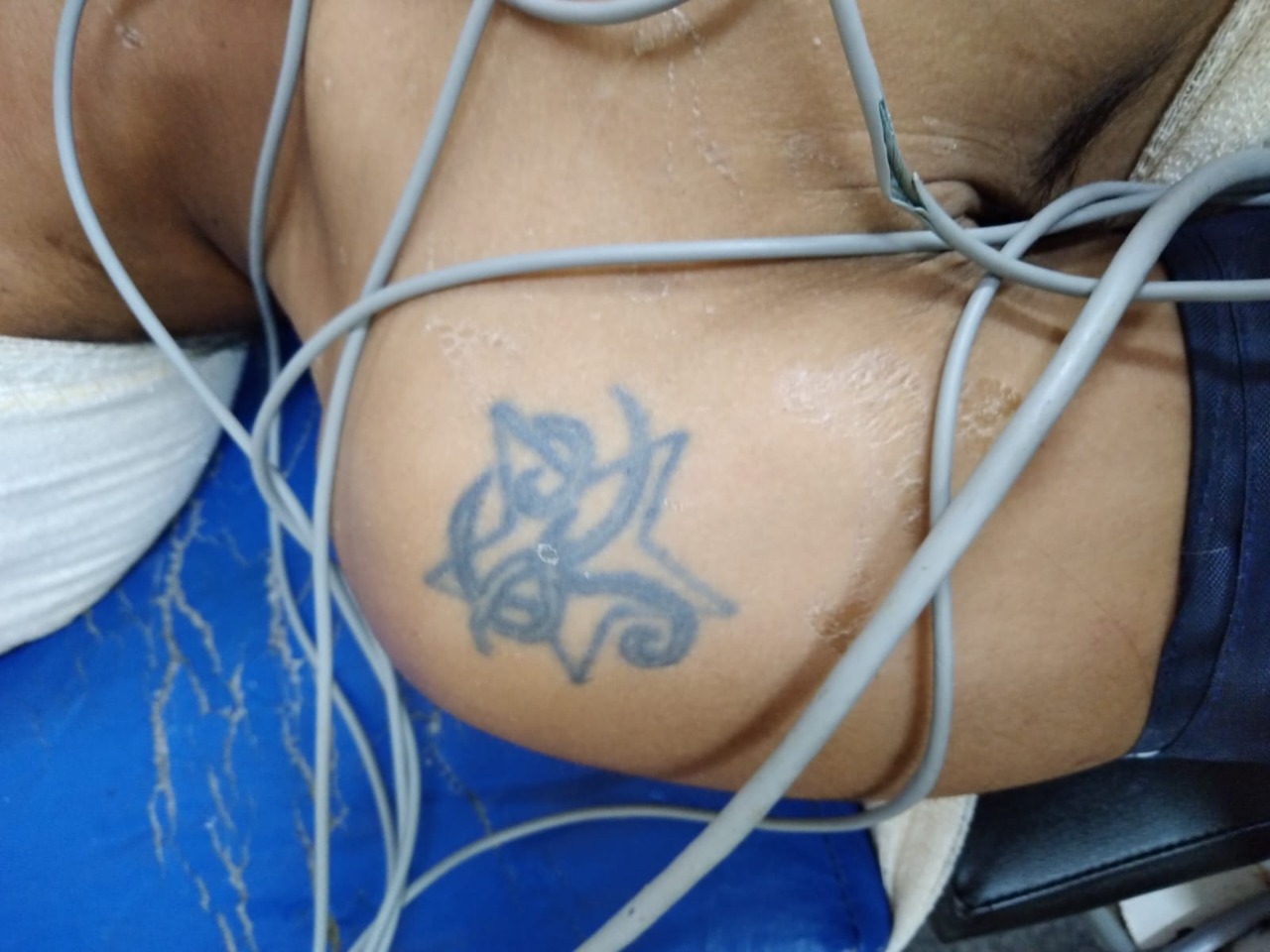 O paciente possui tatuagens pelo corpo, uma no braço direito e outra no ombro esquerdo. O homem está em cuidados intensivos no hospital.