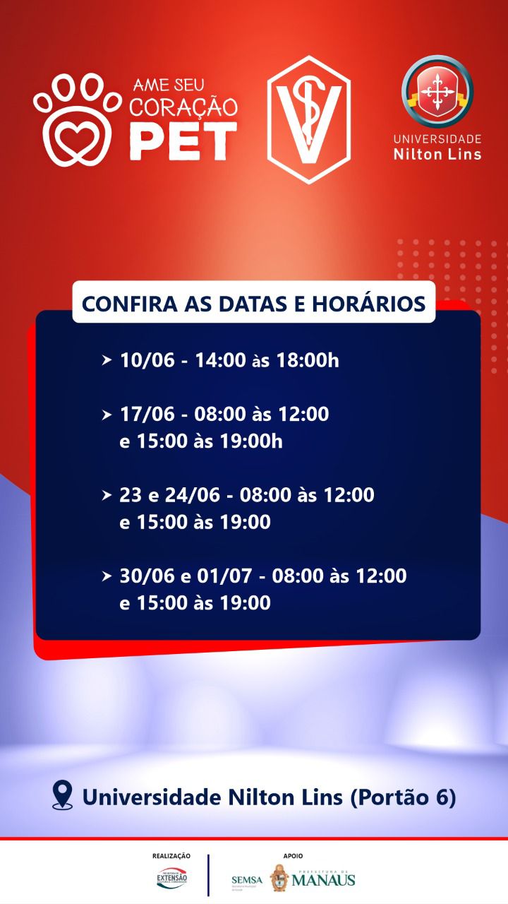 Atenção tutores de gatos e cães de Manaus: professores, profissionais e alunos finalistas do curso de Medicina Veterinária da Universidade Nilton Lins estarão promovendo nos dias 17, 23, 24, 30 e 1º de julho, o atendimento gratuito de seu pet no campus da instituição no bairro Parque das Laranjeiras (portão 6), na zona Centro-sul da cidade.