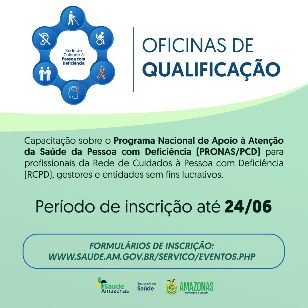 A Secretaria de Estado de Saúde (SES-AM) irá promover a Oficina de Qualificação da Rede de Cuidados à Pessoa com Deficiência (RCPD), nos dias 29 e 30 de junho, e a Oficina de capacitação do Programa Nacional de apoio à Atenção da Saúde da Pessoa com Deficiência (Pronas/PCD), no dia 1º de julho, em Manaus. Os eventos são gratuitos, realizados em parceria com o Ministério da Saúde, e acontecem na capital em formato híbrido, presencial e virtual, para o público da capital e do interior do estado.