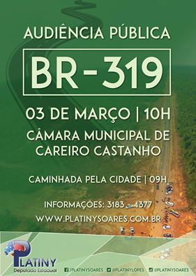AMAZONAS – Dando continuidade ao ciclo de audiências públicas pelos municípios interligados a BR- 319, o deputado Platiny Soares (PV), convida todos para participar da audiência pública que será realizada amanhã (03) as 10h na Câmara Municipal de Careiro Castanho.