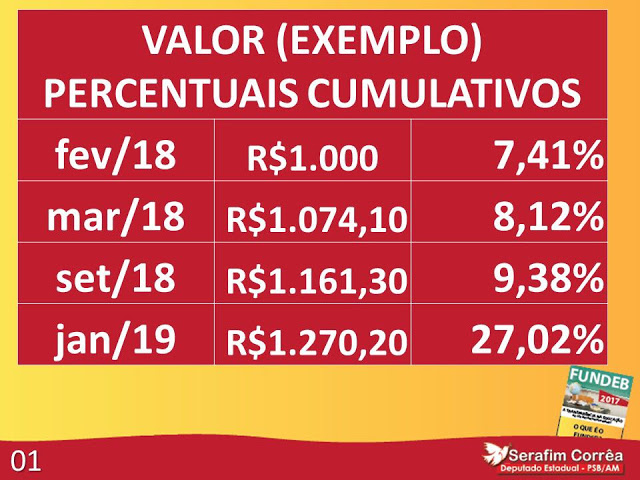 “O cálculo é feito em cima do valor corrigido. Por exemplo, se um professor ganha R$ 1 mil no mês de fevereiro, quando aplicado 7,41%, o valor passa a ser R$1.074.10, em março. Com 8,12% em cima de R$ 1.074.10 no mês de setembro, ficará R$1.161,30 e quando aplicado 9,38 % em cima desse valor resulta em R$1.270.20, totalizando percentual de 27,02% sobre o valor inicial. Quero parabenizar todos os professores. Ao final não temos vencidos e nem vencedores, quem vence é a Educação”, disse Serafim.