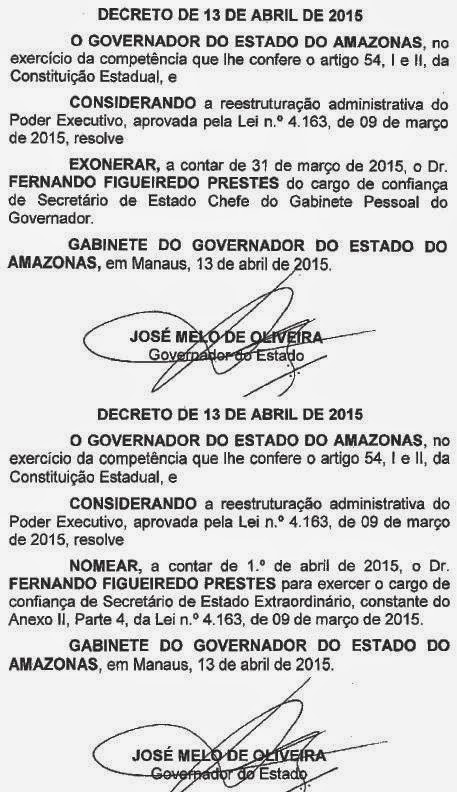 O governador José Melo (Pros) nomeou secretário extraordinário o defensor público Fernando Figueiredo Prestes, filho da presidente do Tribunal de Justiça do Amazonas, Maria das Graças Pessoa Figueiredo. A nomeação foi feita no mês passado. Prestes atua no governo desde a gestão do ex-governador Omar Aziz (PSD), quando foi nomeado secretário chefe do Gabinete Pessoal do Governador. Na nova configuração do governo, arrumada com a reforma administrativa, Fernando Prestes deixou o gabinete pessoal, mas não deixou o governo. Ele se tornou o sexto secretário extraordinário do governo de José Melo. Até a reforma, havia quatro cargos de secretário extraordinário na estrutura do governo, todos ocupados por amigos do poder; com a reforma, o governador criou mais um e também criou o cargo de secretário extraordinário de relações institucionais, que até agora não disse a que veio (veja abaixo o decreto de nomeação de Fernando Prestes).